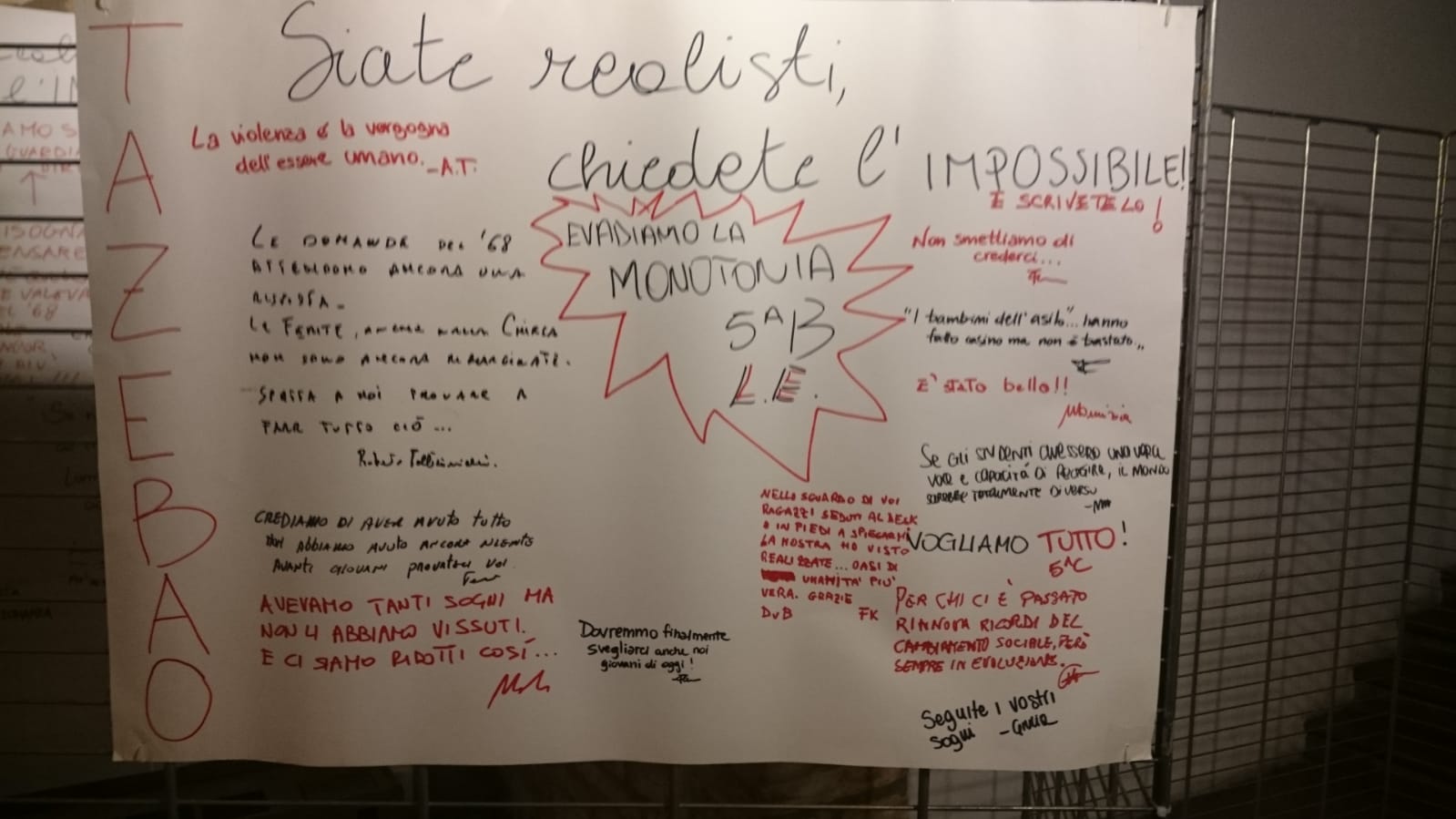 Il percorso della mostra inquadra il Sessantotto all’interno dei profondi cambiamenti che hanno modificato l’Italia e la società occidentale, percorso segnato dall’istanza di autenticità rivendicata dai “giovani” con esiti contradditori. Il superamento di vecchie consuetudini a favore di forme di libertà e di socialità si risolverà nel successo di quell’individualismo radicale che ispira la società odierna.